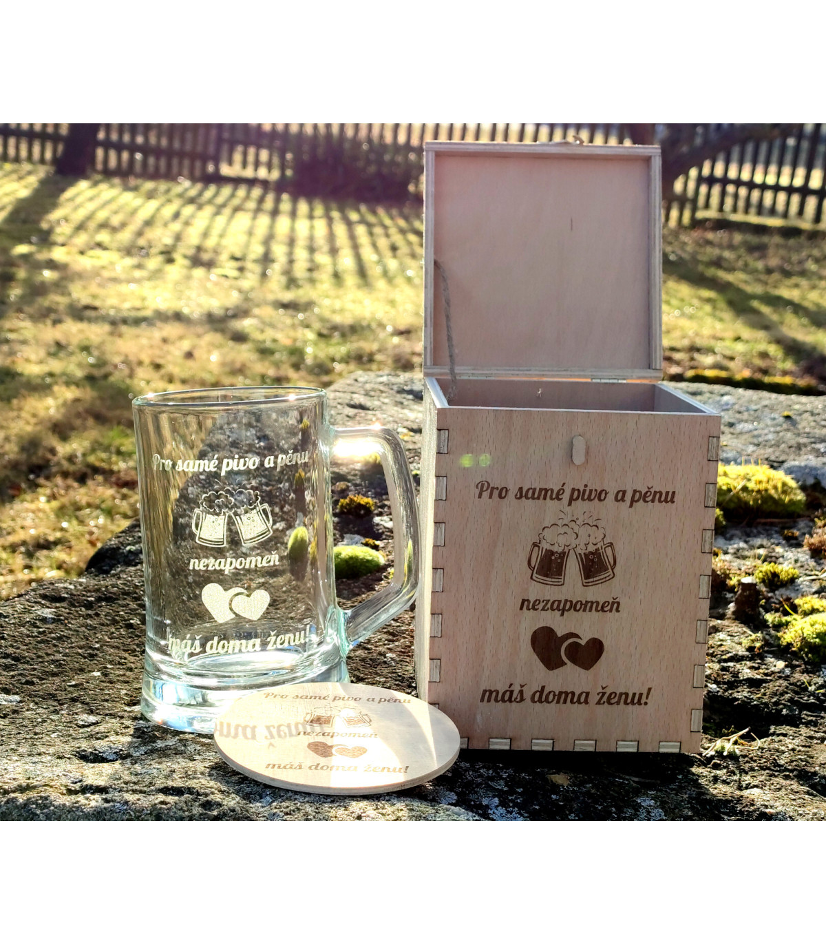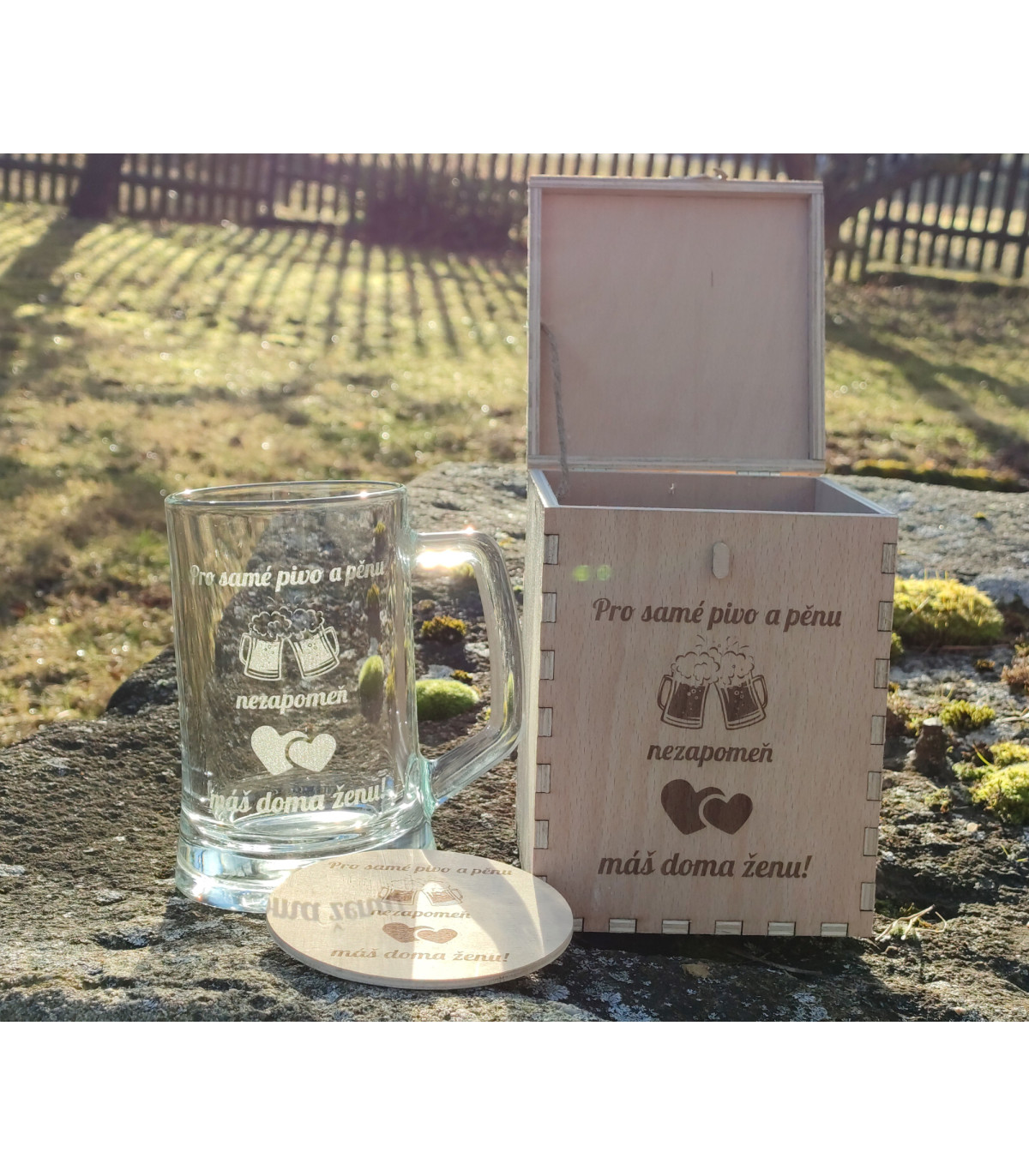 Skleněný půllitr s valentýnským motivem pro muže. K dispozici je varianta bez krabičky a podtácku nebo sada s krabičkou a podtáckem. Motiv je vytvářen pískováním a laserovým gravírováním pro trvalé a odolné zdobení skla vhodné i pro běžné používání.