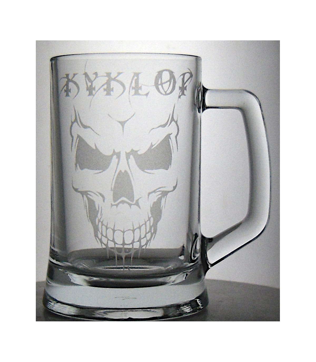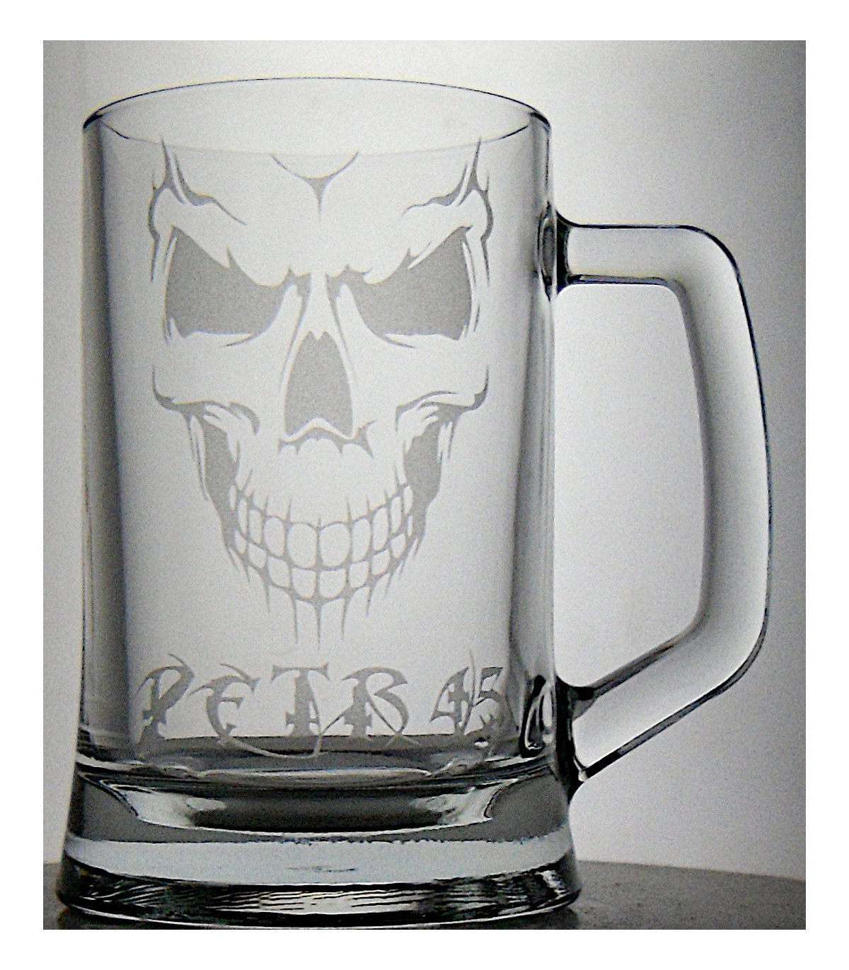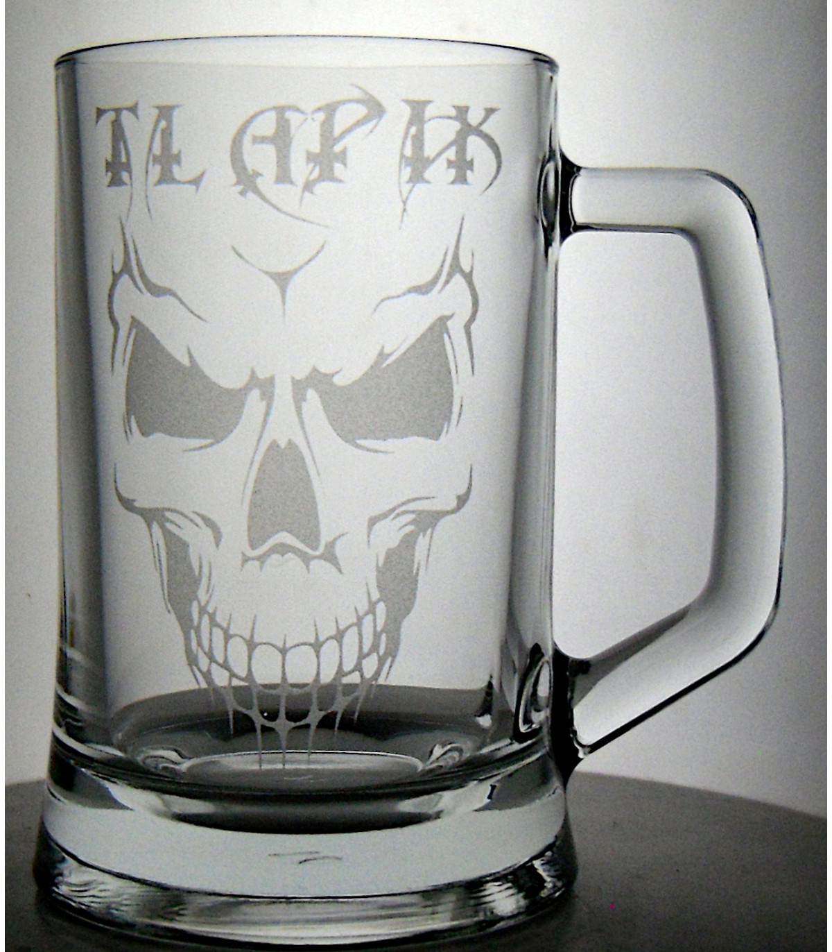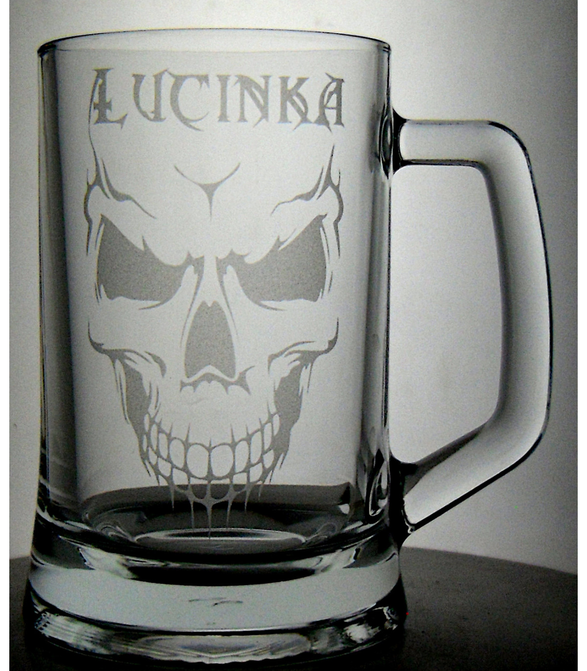 Skleněný půllitr s motivem lebky. Možnost doplnění jména nebo jiného motivu na přání. Motiv je vytvářen pískováním a laserovým gravírováním pro trvalé a odolné zdobení skla. Vhodné jako dárek pro příznivce rocku, metalu a výrazných motivů.